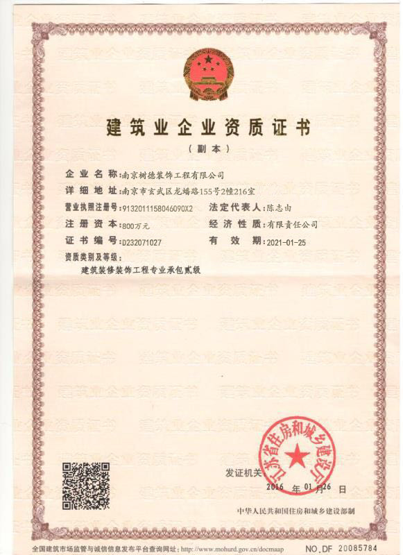 恭喜南京树德装饰工程有限公司获得建筑业企业资质证书,公司成立以来,依托规范严谨的管理、放心可靠的环保材料、合理的价格、高品质的质量、细致周到的快捷售后服务,赢得了客户的信赖。